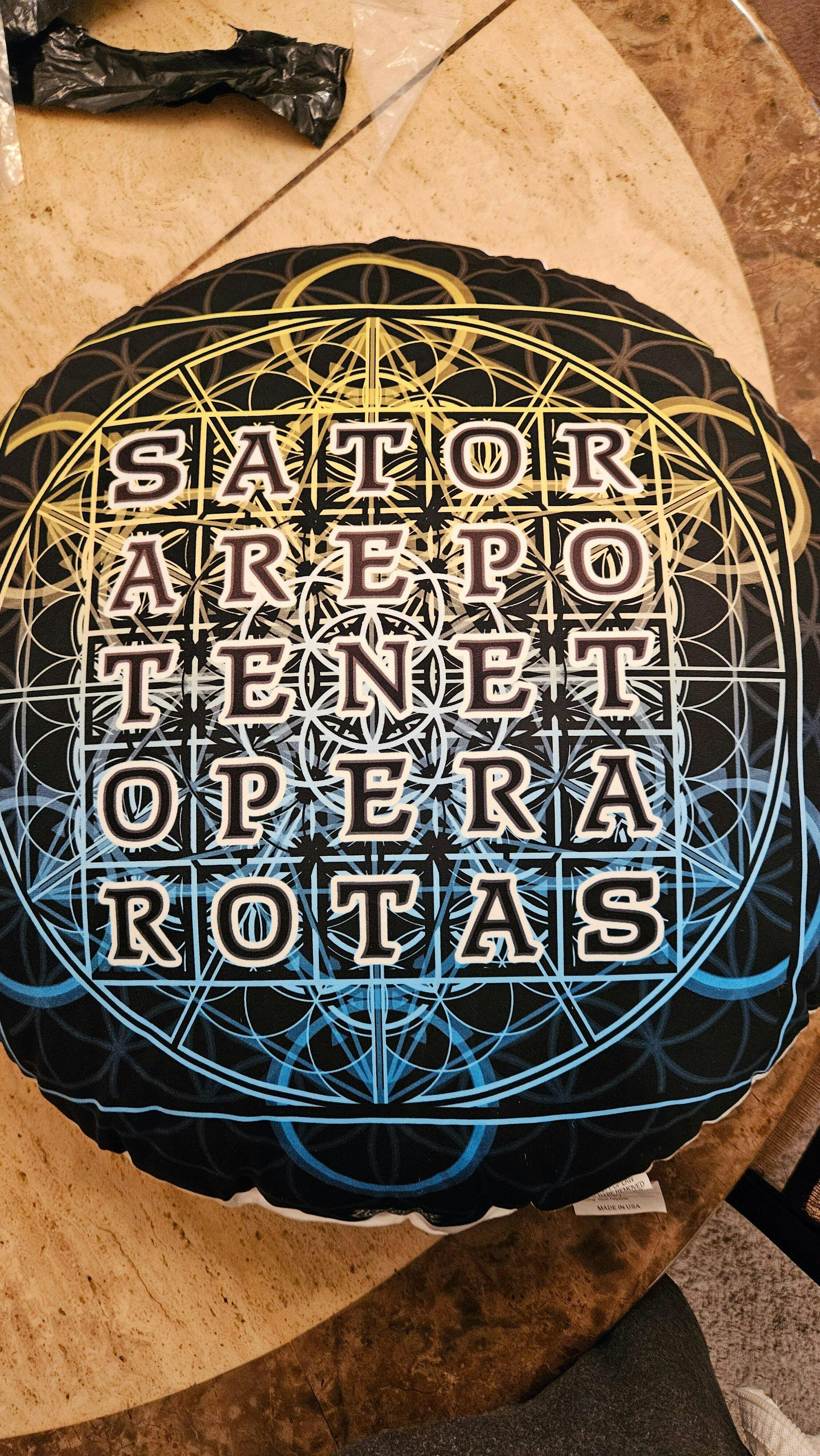 The SATOR Square sits at the heart of a living mandala, radiating from gold to deep blue like light passing through an ancient doorway. This custom-shaped pillow turns the legendary palindrome into a soft geometric talisman for your home.